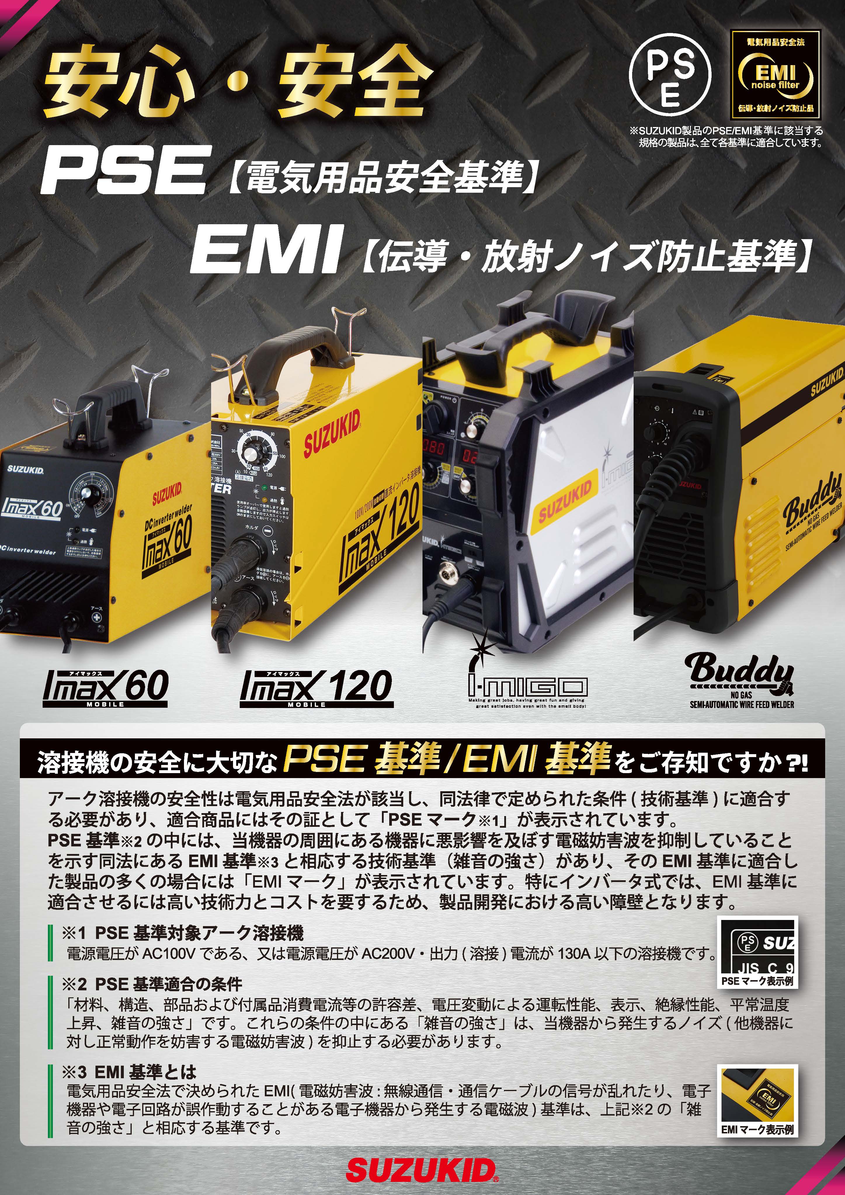 スズキッドは、電気用品安全法の厳しいノイズ規制基準(EMC規制)を クリアしている数少ない溶接機メーカーです。どうぞ安心してご使用ください。