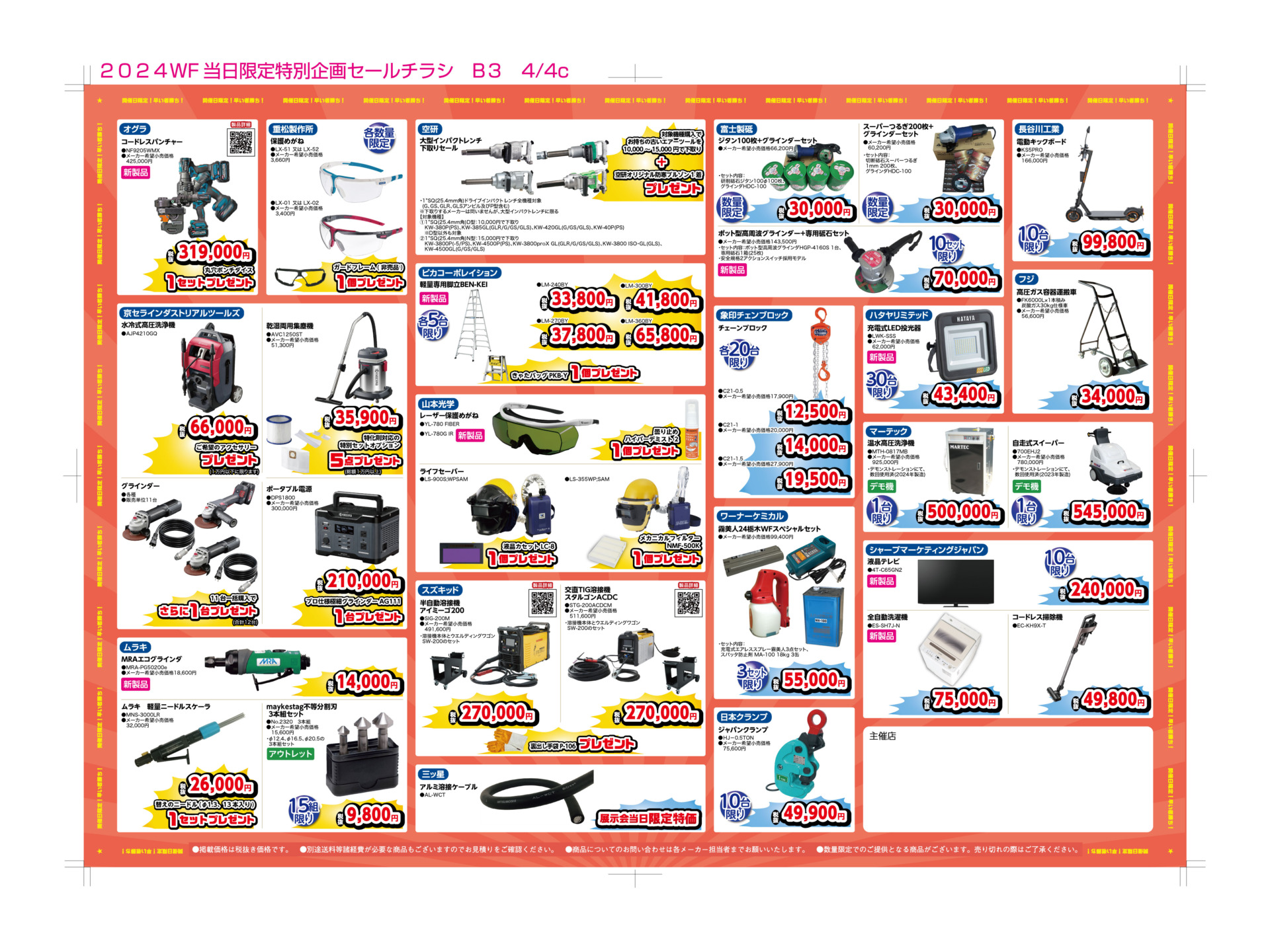 「インバーター式半自動溶接機」「TIG溶接機」「被覆アーク溶接機」「プラズマ切断機」「バンドソー」「3面パノラマ自動遮光面LED」「7立米対応溶接ワゴン」「マグネットシリーズ」など、各種機材の展示、実演、商品説明をさせて頂きます。