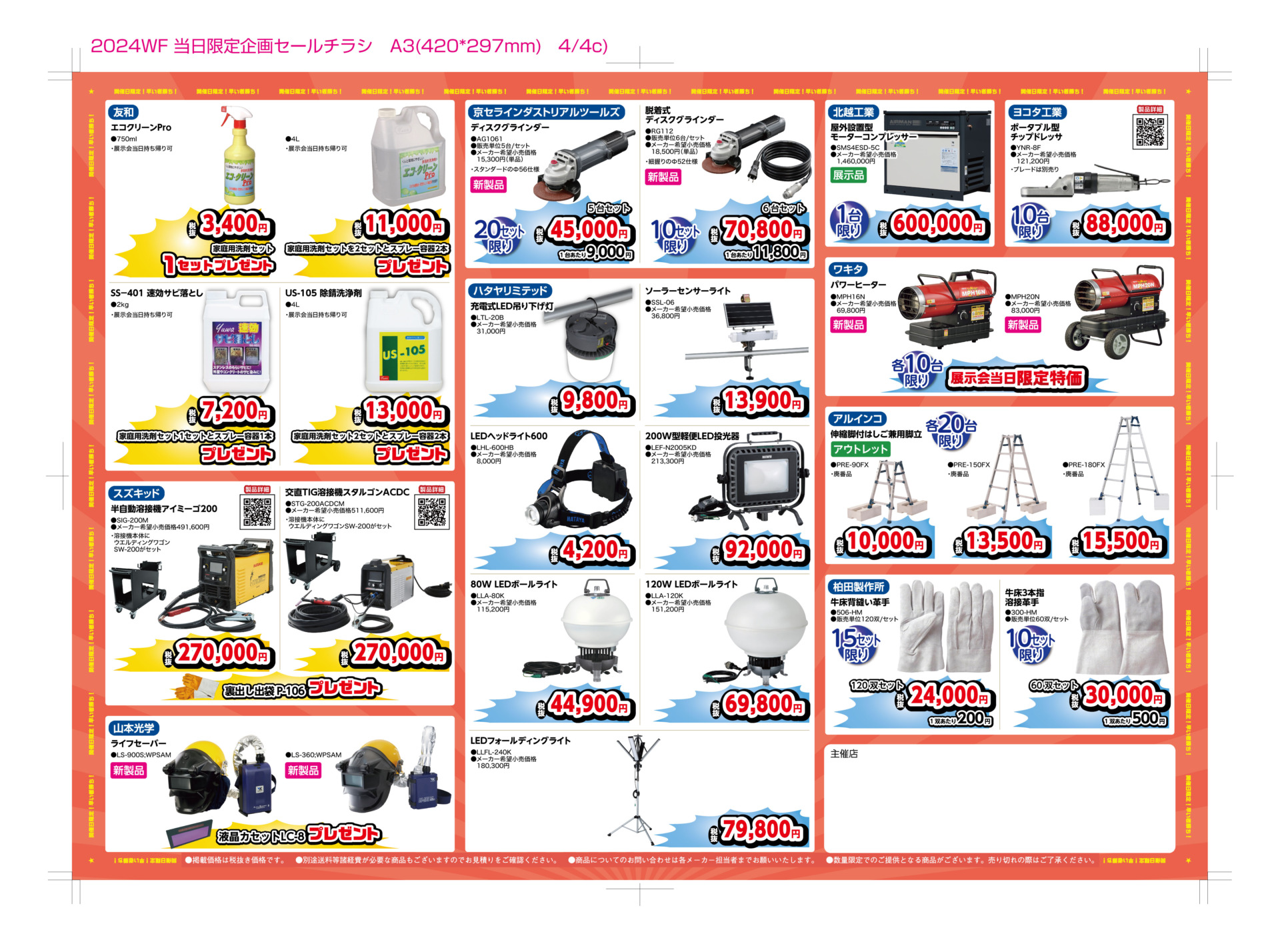 「インバーター式半自動溶接機」「TIG溶接機」「被覆アーク溶接機」「プラズマ切断機」「バンドソー」「国内初の3面パノラマ自動遮光面LEDライト」「7立米対応溶接ワゴン」「マグネットシリーズ」など、各種機材の展示、実演、商品説明をさせて頂きます。