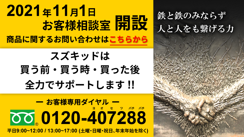 この度、2021年11月1日(月)より「お客様者相談室」を開設致しましたので、お知らせ致します。 スズキッドは買う前・買う時・買った後を全力でサポートします。 受付時間 平日 月〜金曜日、9:00〜12:00/13:00~17:00 (土曜・日曜・祝日、年末年始を除く) ※ユーザー様専用ダイヤルとなりますので、恐れ入りますが業者様のご使用はお控えいただけますようお願い致します。 詳しくはこちらのページをご覧ください