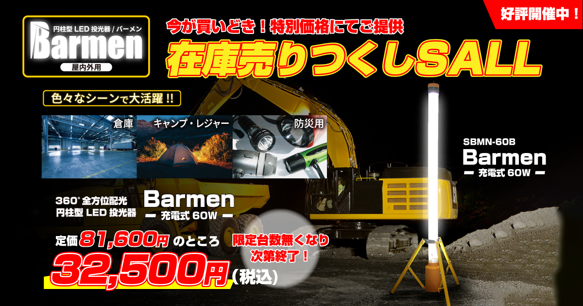 工事現場やキャンプ、防災用など様々なシチュエーションで活躍できるBarmenがお得に購入できる在庫売り尽くしセールを開催!限定数無くなり次第終了のため、ぜひこの機会にBarmenを手に入れてみてはいかがでしょうか。 キャンペーンページはこちら