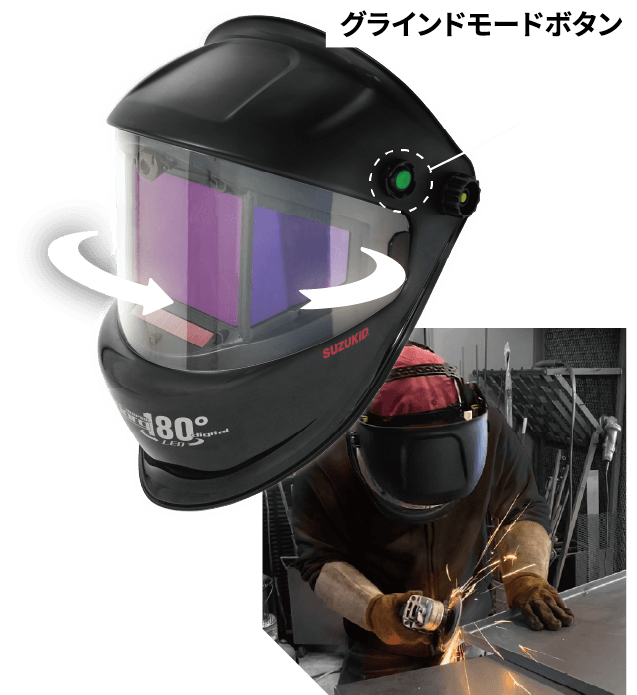 装着したままでワンタッチ切り替え(溶接/切断⇔グラインドモード)が可能なグラインドモードボタン装備(本体外側左 緑色ボタン)
