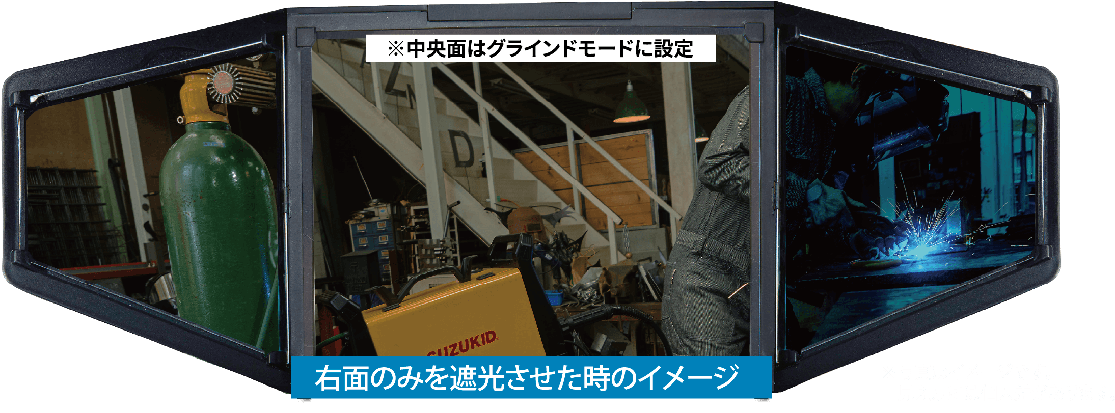デジタル制御 “新感覚180°パノラマワイドビュー” 7つのセンサーで作業によって3面を個別に調整が可能。オートモード(遮光度・感度・戻り速度)では、センサーが溶接光に適した遮光度を自動設定!!